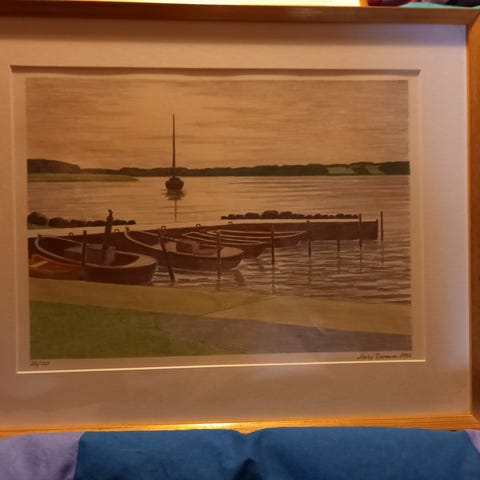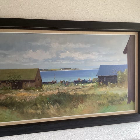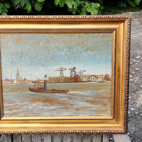 Maleri med motiv af et landskab, der inkluderer en båd på en flod eller kanal og en kirke i baggrunden. Maleriet er indrammet i en guldfarvet ramme. Farverne domineres af blå, grønne og jordfarver. H.74cm, B.87,5cm afTorben Møller