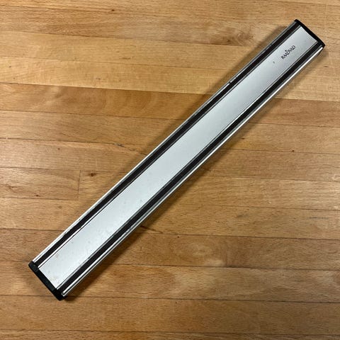 Magnetisk knivholder lavet af træ med flere magnetiske punkter til opbevaring af knive. Inkluderer monteringsskruer til fastgørelse på væg. Designet til at holde knive sikkert og let tilgængeligt i køkkenet.