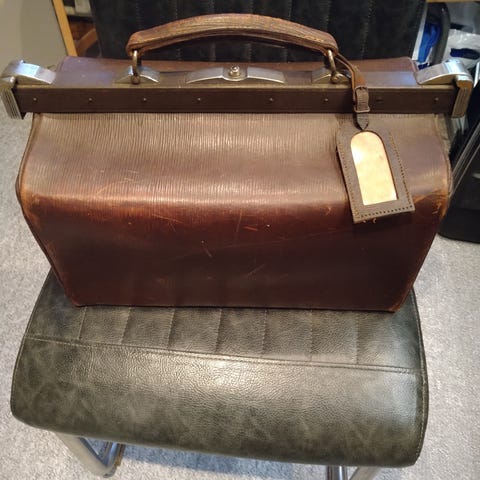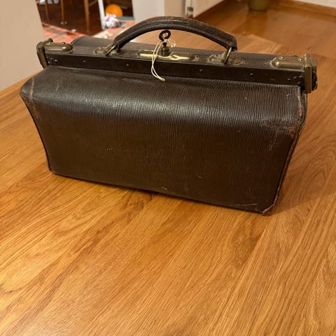 Str 60 cm/30 cm/20 cm. Gammel jordemodertaske i brunt læder