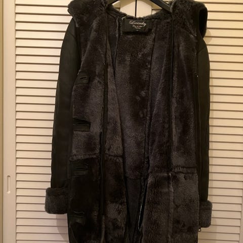 Super flot lammeskinds frakke med brun mink. Størrelse 40. Der er brun mink på forsiden af frakken samt på hætten og bærestykket på ryggen. Der er beige foer.