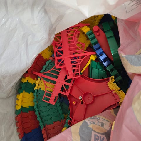 Stor bane med to biler, bakke/tunnel, drejeskive, skiftere, kran, broer, ramper, forhøjere, lygtepæle, bakke med stop/go og start-mål med baneskift. Nogle klodser har brugsspor.