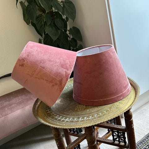 Ovale lampeskærme fra G&C interior. Helt ny ubrugt. Fejler intet. Måler overst i oval 18x23cm nederst 24x31cm og 20cm høje. Super flot pink fave i bomuld næsten hør stof udvendigt og guld fave indvendig som giver mega flot lys. Sælges samlet og samlet pris. Passer til E27 fatning