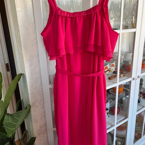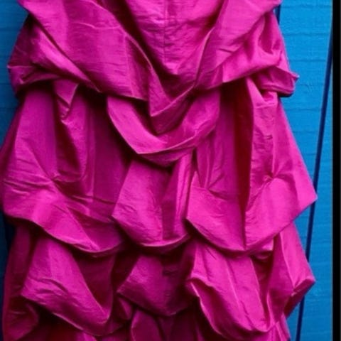 Pink festkjole str 36,polyester. Indsyet tylskørt. Rødt foer foroven. Brystvidde ca. 80-85. Taljevidde ca. 64-66.Længde fra øverste kant foran 126. Fra Yve London.