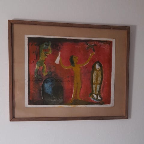 Super fedt litografi af Reidar Magnus, signeret og nummereret 3/100 eget tryk, lille plet under ramme(sidste foto), ramme slidt- kan sendes for 80 med gls