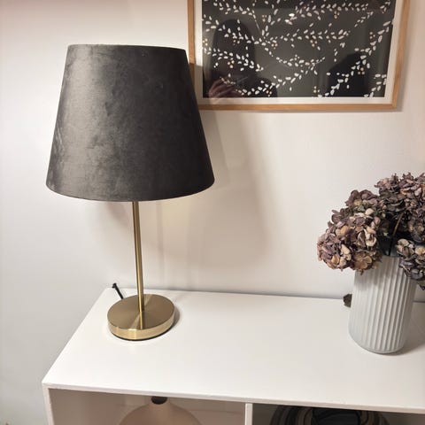 Super flot lampeskærme fra H&M brugt meget let og næsten som ny. Måler overst Ø 19cm nederst Ø 30cm og H: 23cm passer E 27 fatning. Stoffet er velour udvendig og kridt hvid plast indvendig. Sælges samlet og samlet pris.