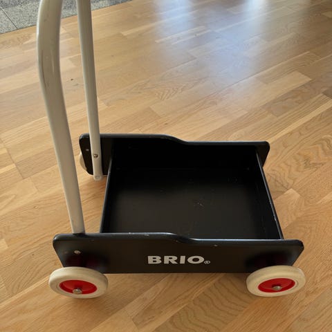 BRIO Træ Legevogn i sort farve med hvide og røde hjul. Vognen har et håndtag i metal og er designet til børn. Den er velegnet til leg og transport af legetøj.