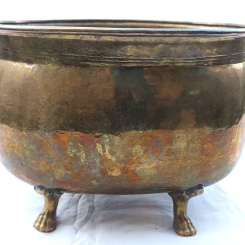 Smuk jardiniere, eksempelvis til små planter eller pot pouri. Tung messing, vejer ca. 1300 gram. Bredde ca 34. Passer fint i den franske landstil. Kan sendes