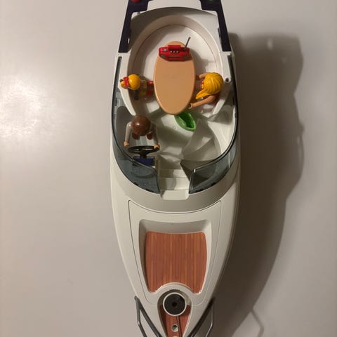 Båd og trailer og en figur. Alt sammen i god stand. Med redningsring og to årer. Snoren kan trækkes ud.