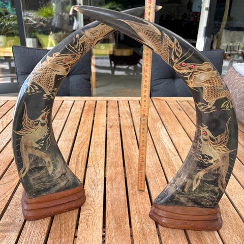 Tyre horn, kohorn, western saloon pynt. Lige til at hænge op og skabe stemning. Mål: bredde fra spids til spids er der 125cm. Diameter på det tykkeste sted er ca. 9cm. Kan efter nærmere aftale evt. leveres til KBH. K.