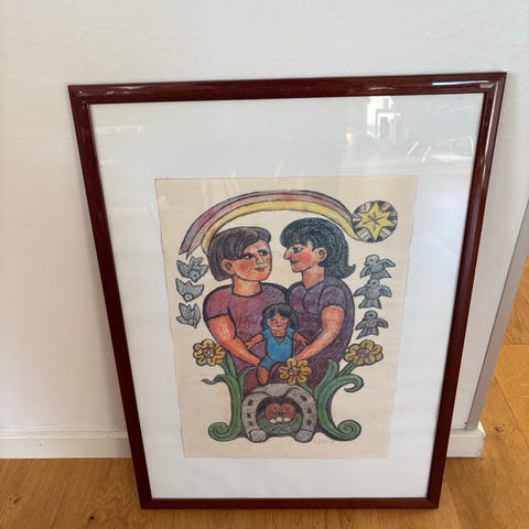 med motiv af en kvinde, der skubber en barnevogn. Billedet er i farver med ferske blå, røde og hvide nuancer og er professionelt indrammet i guldramme med passepartout og ophæng.. Selve motivet måler ca. 20 x 30 - og incl. ramme cirka 30 x 40 cm.