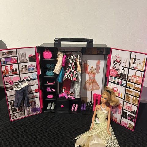 Transportabelt klædeskab med tøj, sko og takser, som passer til Barbiedukker, alle hylder kan tages ud samt udfoldeligt tøj stativ