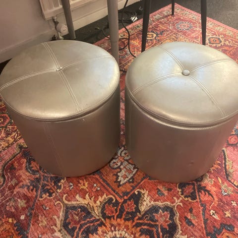 To flotte hvide opbevaringspuff’er i læder. De måler 40x40x40 cm og er både praktiske og dekorative. Puff’erne kan foldes sammen, når de ikke er i brug, og de har god plads indeni til opbevaring af fx tæpper, legetøj eller andet. Samtidig fungerer de som ekstra siddepladser, så længe man holder sig til en moderat vægt. De er i pæn stand og passer perfekt i stuen, på børneværelset eller i entreen.