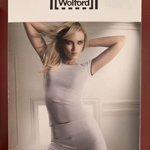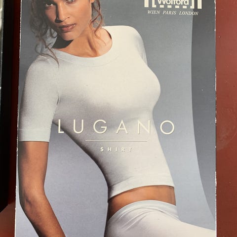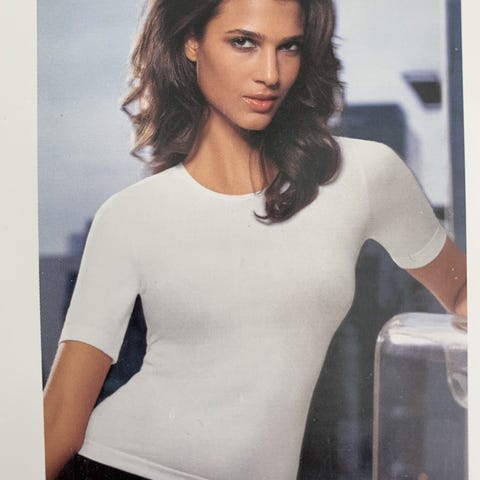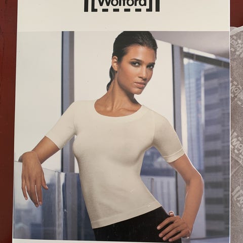 T-shirt fra Wolford i hvid farve størrelse L, hvilket modsvarer størrelse 44-46, med 3/4 ærme. Blusen er fremstillet af 48% bomuld, 48% polyamid og 4% elastan. Blusen bliver af Wolford betegnet som Cordoba Pullover