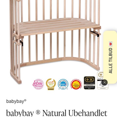 Virkelig flot og velholdt babybay bedside crib. Sengen kan monteres til sengen med beslag, som sidder på sengen. Sengen fremstår i virkelig flot stand og kommer med madras, 2 hvide sengerande og 3 lagener.