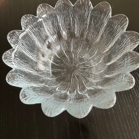 Holmegaard serveringsskål i klart glas med bølget kantdesign.