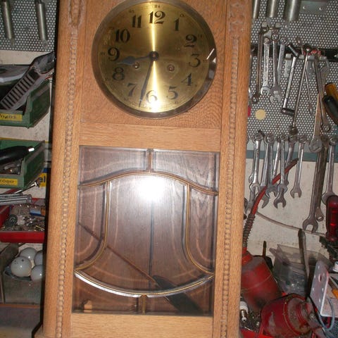 Vægur, Afsyret egetræ, Antikt vægur i afsyret egetræ. I god stand. Et gammelt flot arvestykke som har været i familiens eje i ca 100 år. Går på batteri, pendulet virker ikke.Urets mål: Længde 78 cm, bredde 32 1/2 cm.ur skiven måler 21 x 21 cm. Sendes ikke.
