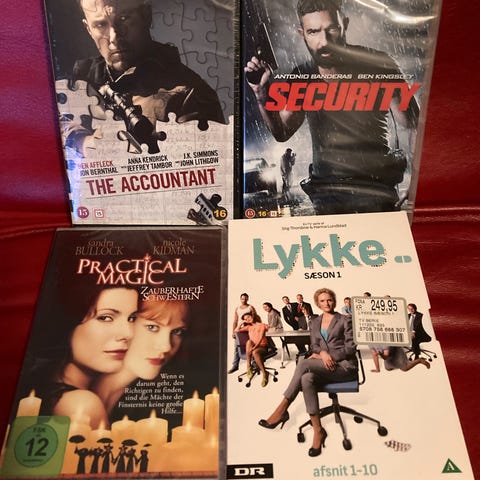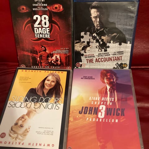 Originale DVD- og Blu-ray-film, nogle er stadig ny i folie. Næsten alle med danske tekster. Tjekket. Viser perfekt. Affraid. American assassin. Accountant. Apollo 13. Bad boys. Bombshell (ny). Blitz. Battleship (ny). Bait. Bad moms. Blackout. Black phone. Cop car. College road trip. CSI 8. Company men. Deep rising (uden DK tekst). Den skaldede frisør (ny). Drowning by numbers. Eye for an eye. Enforcer. Fright night. From hell. For evigt. Freaks (ny). Fury. Goon. Ghostbusters. Hunters moon. Harry Potter. Horsemen. Insurgent. Interstellar (ny). John Wick 3. Judge. Jul i verdensrummet. Kingsman. Keep Watching (uden DK tekst). Kill switch. Last night. Losers. Little things. Lockout. Long weekend/REC 2/Rovdyr (ny). Lie to me. Mickey blue eyes. Montalbano. Marry me. Magic Mikes last dance. Moulin rouge. Olsen-banden julekalender. Operation fortune. Prometheus. Player. Push. Penelope. Pretty woman (ny). Rimeo og Juliet (ny). Ruins. REC. Snowman. South Park. Samme dag næste år. Superhero movie. Surviving Christmas. Silencing. Skyscraper. Story of us. Space between us. Striptease (ny, uden DK tekst). Terminal. Transporter. Wind river. Wrong turn (uden DK tekst). Witch hunters. Wild child. 60 kr for 1 DVD/Blu-ray