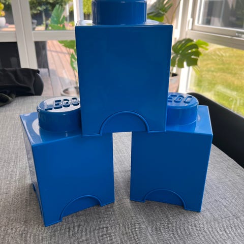 LEGO opbevaringsbokse i form af byggesten. Boksen kan bruges til opbevaring af LEGO-klodser eller andre småting.