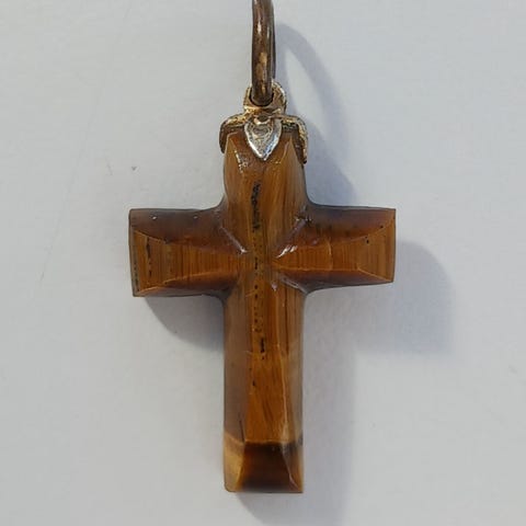 Håndskåret gammelt kors-vedhæng af ben m sølvøsken ( 4.9 x 3,3 x 0,4 cm ). Fint forarbejdet med mange små detaljer. Renset, velholdt uden fejl og mangler. Original kæde, L 46,5 cm, medfølger. Sjældent kors.( Sender gerne + 29 kr )