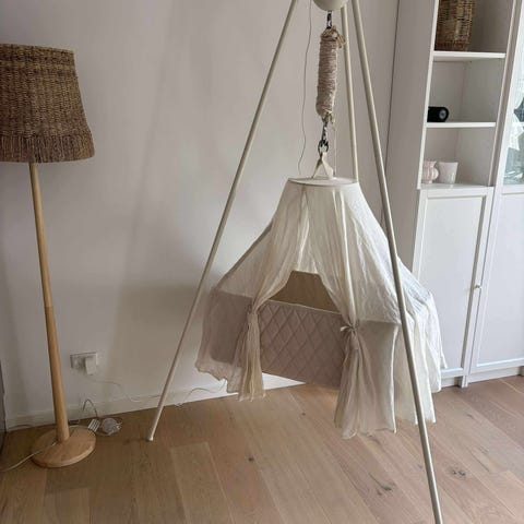 Virkelig sød moon boom i flot orange/koral farve med ophæng. Der er madras i vuggen. Der er en lille mør plet i bunden - den er ikke forsøgt fjernet. Derfor prisen.