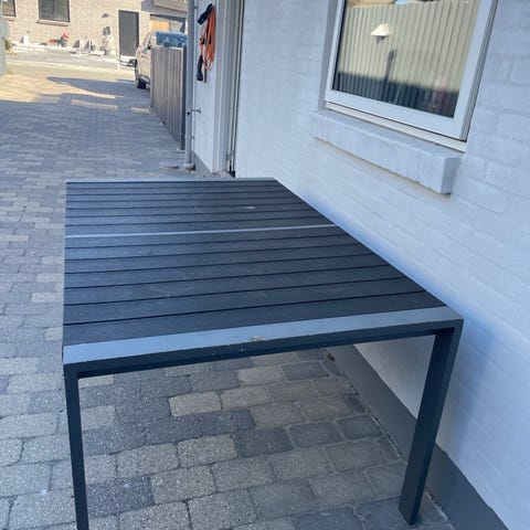Udendørs havebord med sorte/mørke stenplader og metalstel. Bordpladen er opdelt i tre sektioner og måler cirka 190 cm i længden. Bordet er velegnet til brug i haven eller på terrassen og er fremstillet af materialer, der egner sig til udendørs brug.