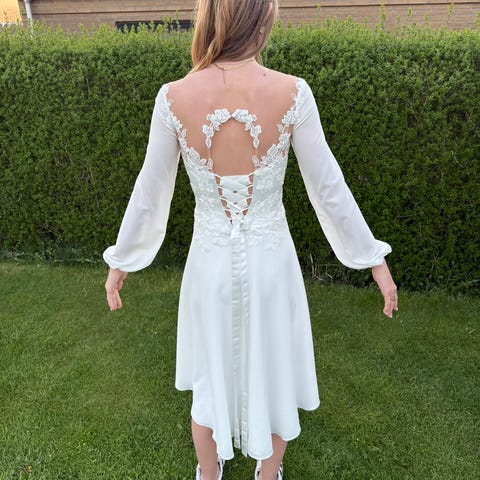 Brugt én gang, som ny, str. 36, købt i Brudesalonen Kennedys i Sabro. Kjolen har blonde ved halsen og forstykket og er skåret, så den er lidt længere bagpå end foran.