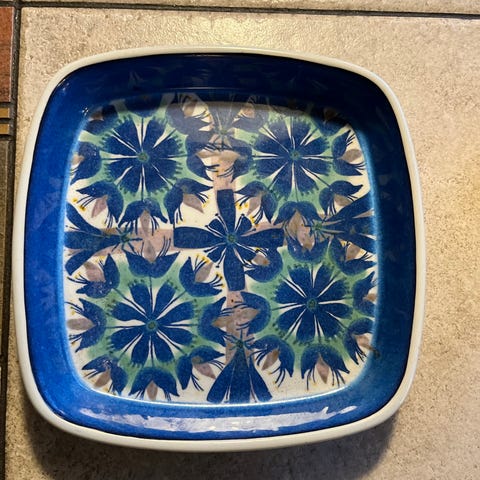 Royal Copenhagen Fajance firkantet tallerken med blå mønster.