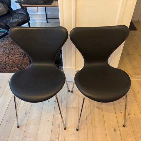 Stolene er for nyligt blevet ombetrukket på nye syverstole-skaller hos proff. møbelpolstrer, så de er helt friske og stive i ryg. Pris pr stk.