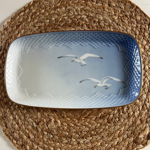 Bing & Grøndahl fajance fad med motiv af måger og et håndtag. Med guldkant.