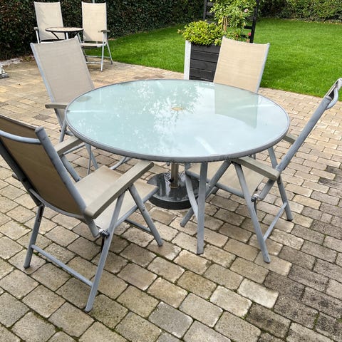Udendørs havebord med rund glasplade og metalstel samt 4 matchende stole med metalstel og tekstil sæde og ryg. Sættet er velholdt