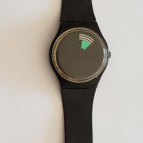 Sælges fra privat samling, VINTAGE sjældent udbudt SWATCH GS102 COSMIC ENCOUNTER - (1986 Halley’s Comet Edition), med få brugsspor og i velholdt stand og rent batterirum (se venligst alle billeder for aktuel stand).