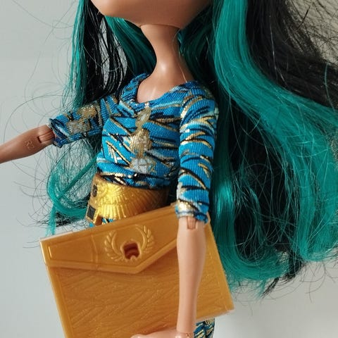 Monster High Cleo De Nile dukke med tilbehør, herunder kjole, sko og små tilbehørsdele.