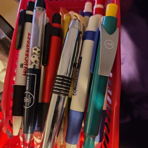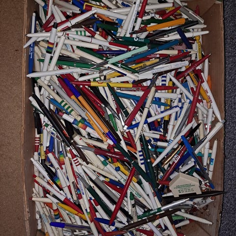 Kan afhentes gratis. Pose med kuglepenne, tryk-blyanter og tuscher m.m. Skriv en sms på 50 41 46 67, hvis du vil afhente. Jeg sender ikke.