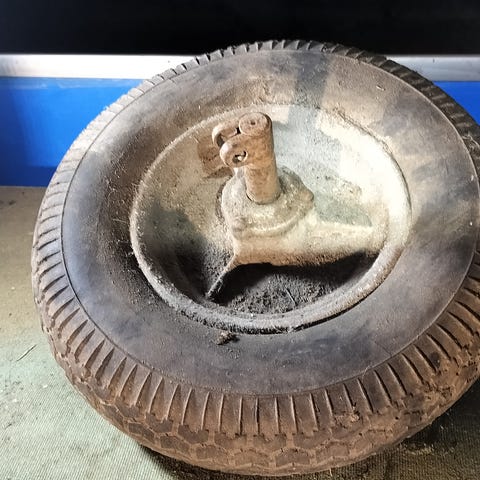 Gammelt hjul til trillebør. Diameter 45 cm. Bredde 48 cm