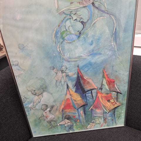Smuk Akvarel, abstrakt.Gul og blå farver.mål:(incl ramme)b.75 h.55