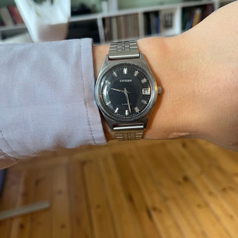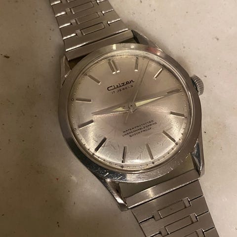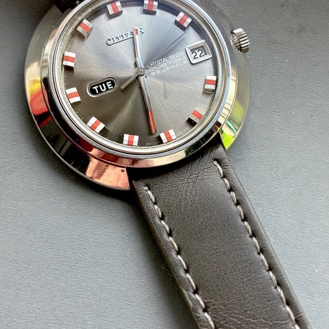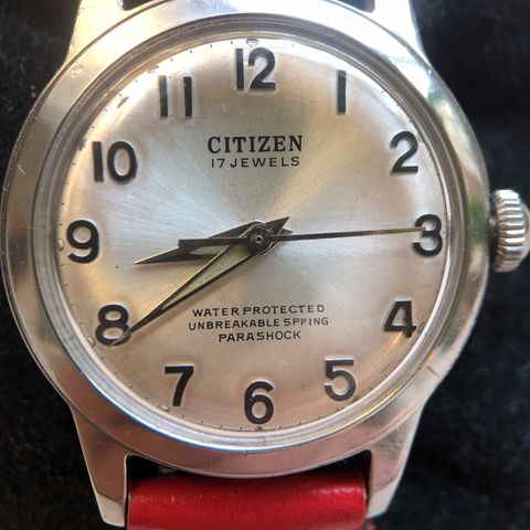 Vintage Citizen med flot sølvfarvet med dag - og dato funktion. Skiven fremstår i rigtig flot stand, uden fugt eller store afskalninger i kanten.