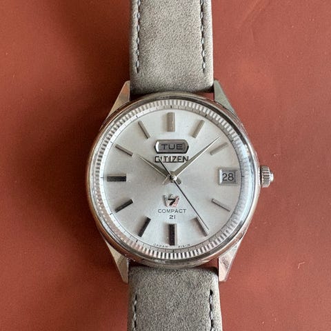 Vintage Citizen med flot sølvfarvet med dag - og dato funktion. Skiven fremstår i rigtig flot stand, uden fugt eller afskalninger i kanten.