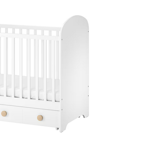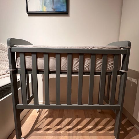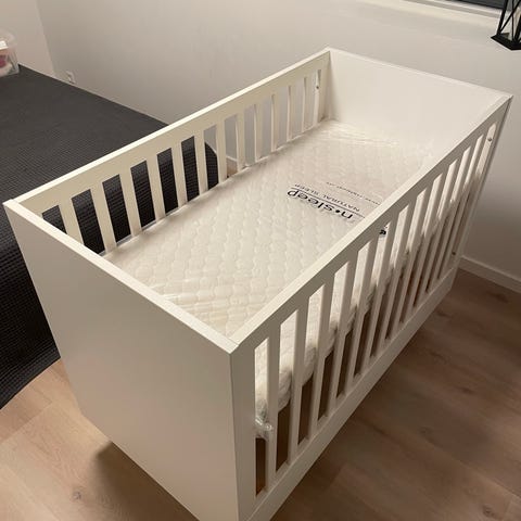 Vi sælger vores tremmeseng (JLY) og madras (IKEA Himlavalv). Vi sælger den sammen med en dyne (IKEA Lenast), en pude (Wellpur) og to sæt sengelinned, madrasbeskytter og undermadras.