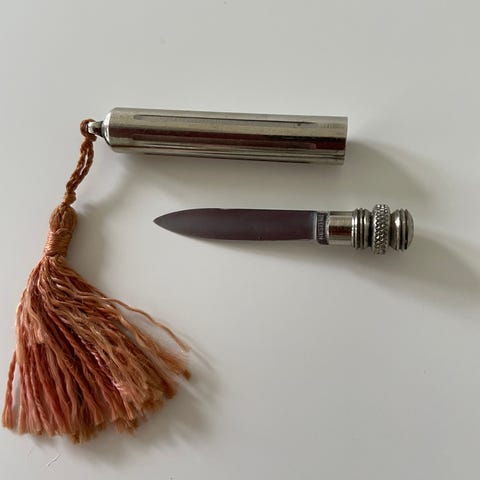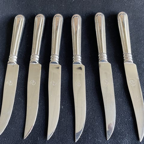 Antik 6 stk frugtknive "messing farvede" med træskaft i en blå æske med rød inderside. Original indpakning, kender ikke designer, måske et svendestykke!