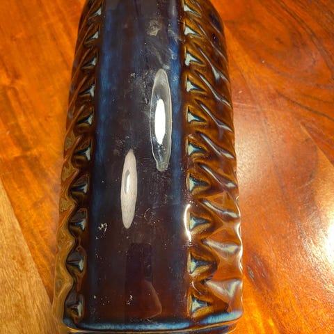 Ukendt keramikvase med brun farve og unik form. Vasen har en glaseret overflade med detaljer i forskellige brune nuancer. Den har en usædvanlig design med og en buet struktur, hvilket gør den velegnet til dekorative formål.
