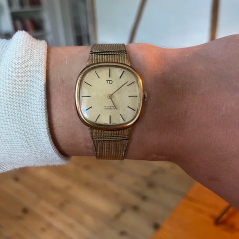 2000 vintage herreur i gulddouble med datofubktion. Mekanisk værk med manuelt optræk. 34 mm uden krone