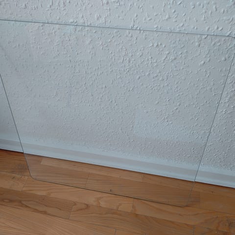 Rund glasplade, klart glas med bløde afrundede kanter. Diameter 59,7 cm. Glaspladen har fungeret som bordplade på et afskrevet bord, fejler intet.