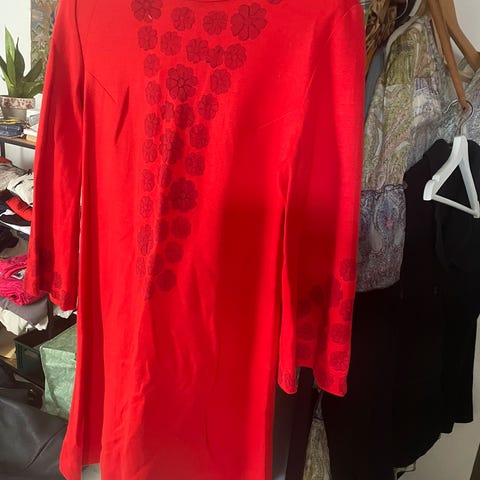Smuk unik rødlig skinnede vintage kjole mærke Hesselhøj, Denmark