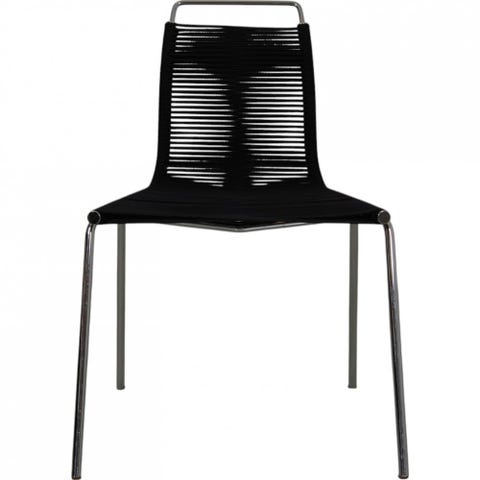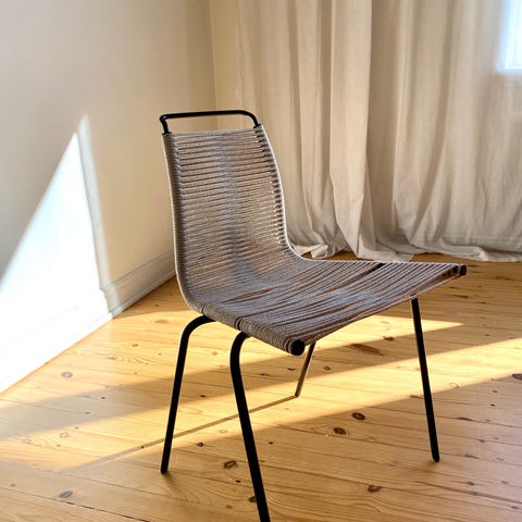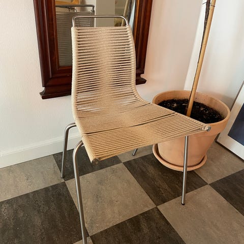 En meget lækker spisebordsstol. Den er minimalistisk og alligevel komfortabel. Poul Kjærholm PK1 med beige flagline og sort stel.