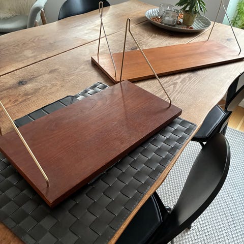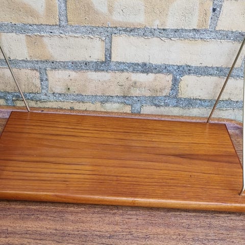 Retro-boghylde af teaktræ med kehlet kant og "messingbærere", 69x23cm.