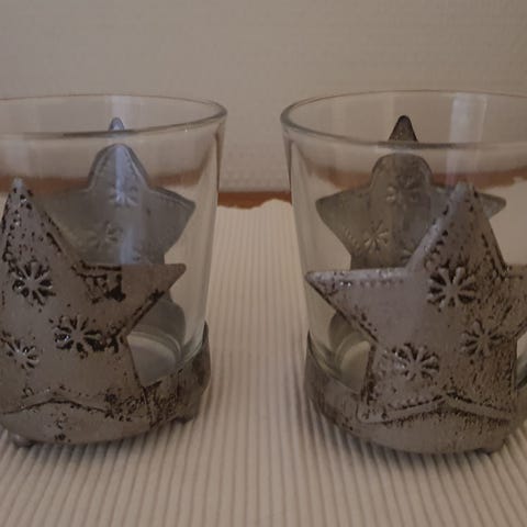 2 søde hvide jule fyrfadslysestager. Den ene har desværre en skade udenpå og de har begge to sorte sod mærker. Dog ikke forsøgt fjernet. Prisen for begge er sat derefter.