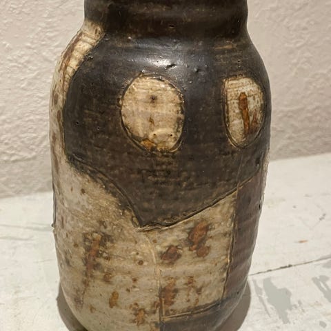 Smuk dansk studiokeramik af Trille Jørgensen (f. 1944). Rå stentøj med chamotte, varm brun/beige glasur og abstrakt dekoration. Klassisk 70’er-udtryk. Undersiden er signeret “trille”.