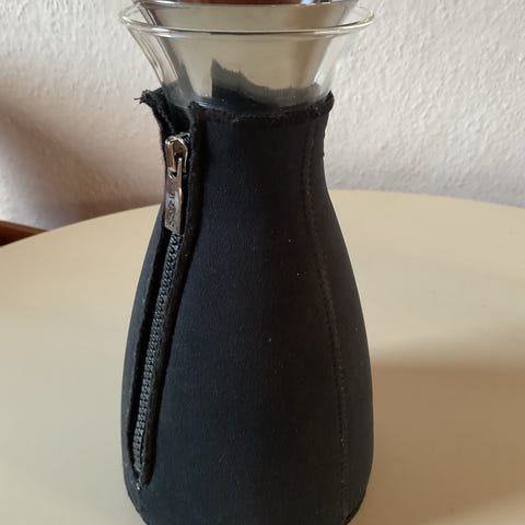 Eva Solo The kande med isolationscover i sort materiale. Karaffelen er designet til servering af the og inkluderer en glaskaraffel, et isolationscover med lynlås samt en prop. Materialet på karaffelcoveret sikrer isolering for at holde the ved ønsket temperatur.