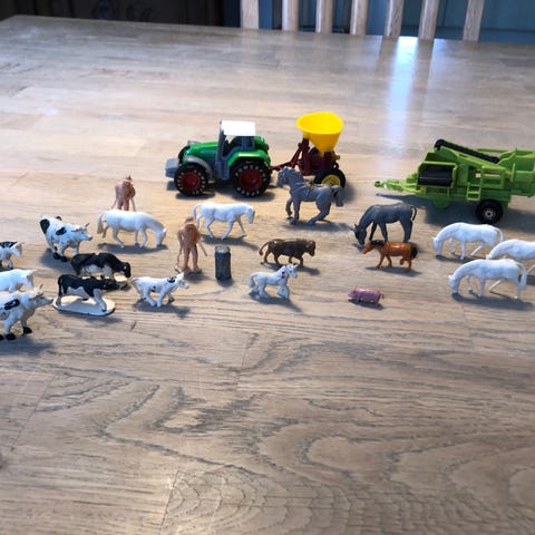 Bondegårdsdyr, traktor med harve, mennesker, indhegning) - bevægelige led