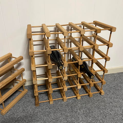 Tre hylder med plads til 5 flasker hver (dvs. 15 flasker i alt)